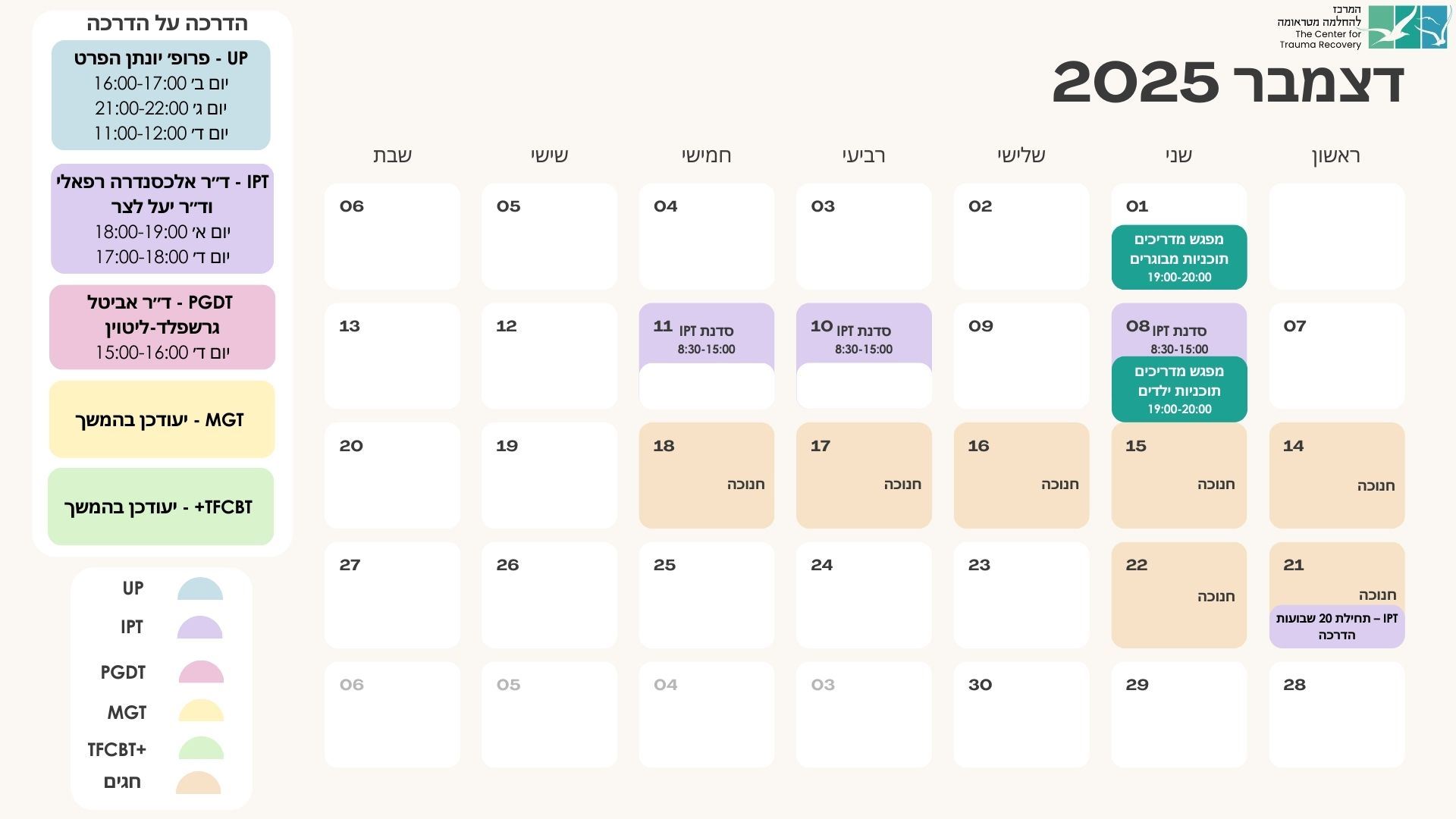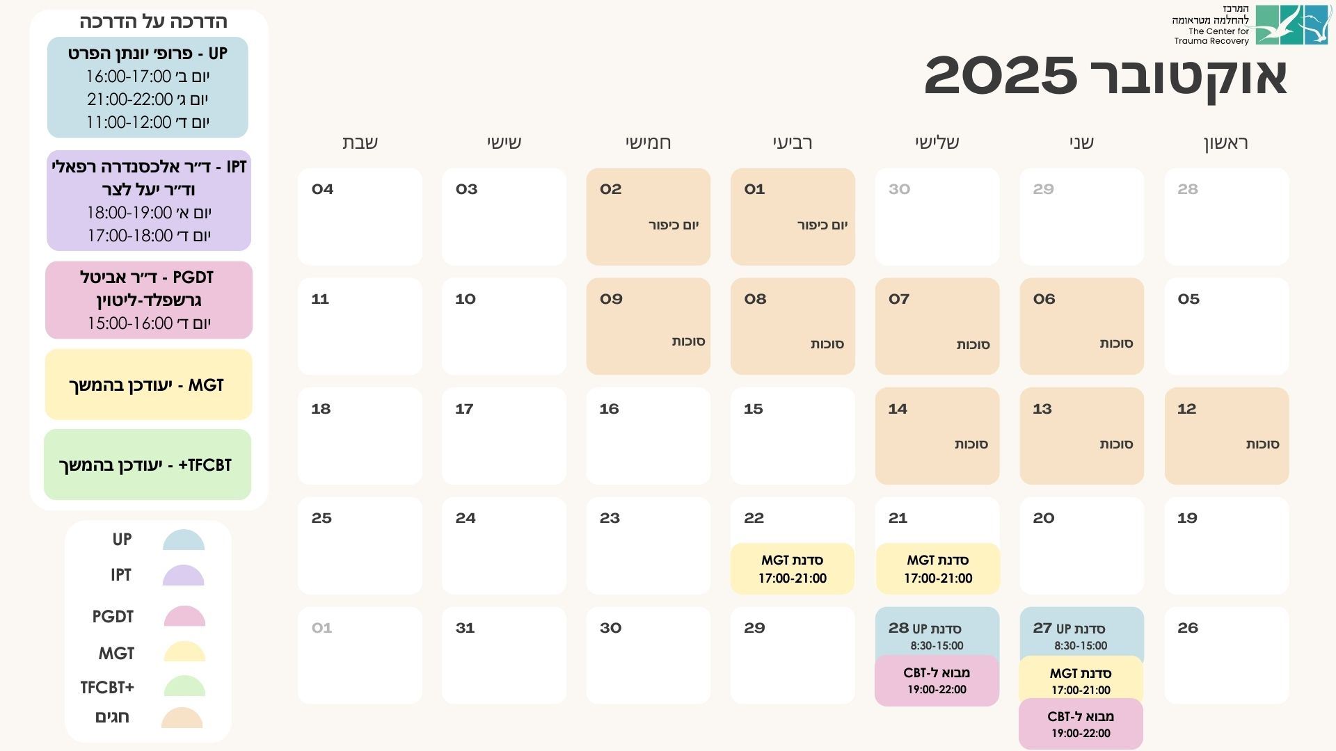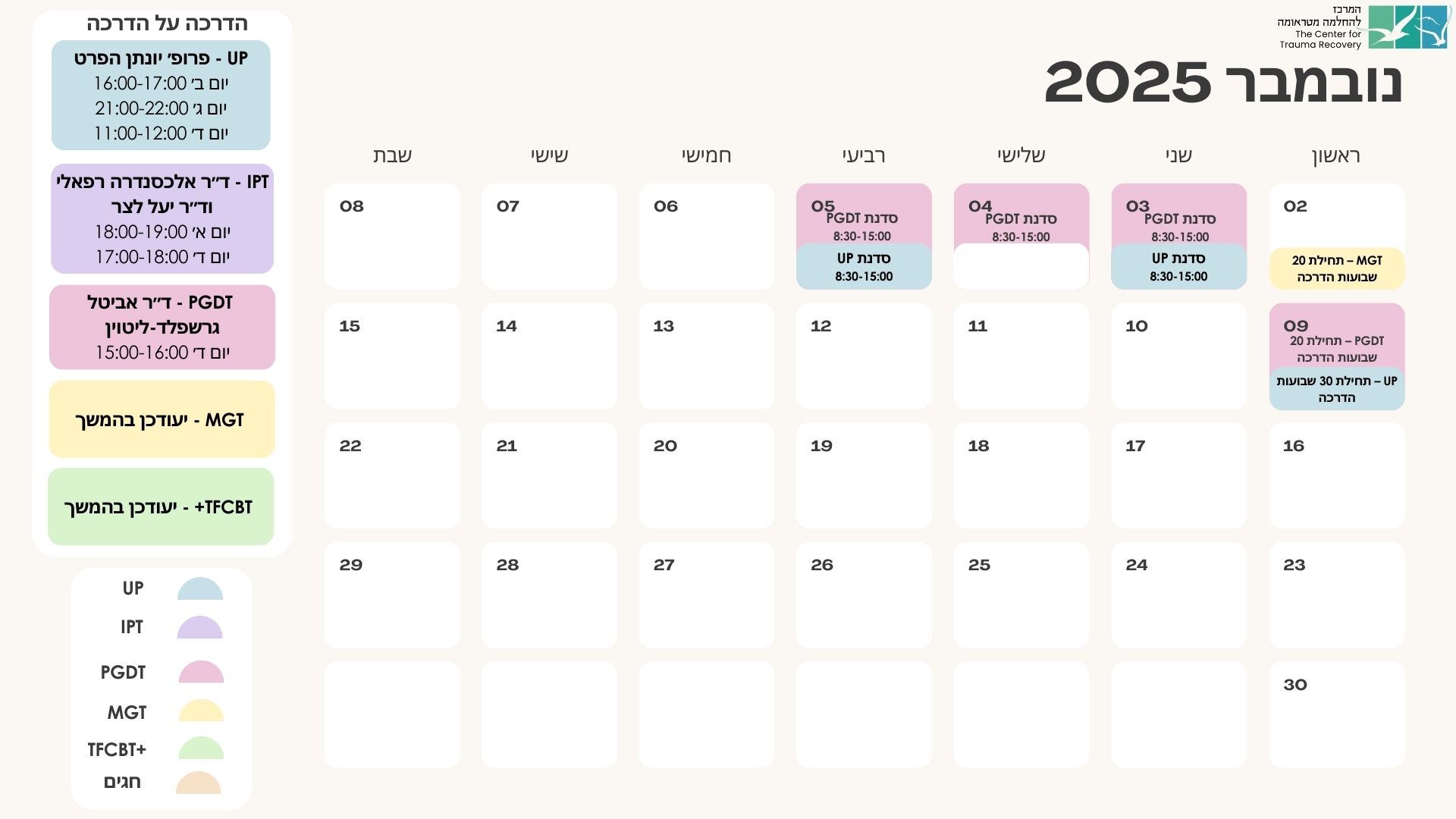 אנחנו נרגשים שאתם חלק מהצוות שלנו. בדף זה ריכזנו עבורכם את כל המידע, הקישורים והחומרים הדרושים לכם כחלק מצוות המדריכים של המרכז להחלמה מטראומה.